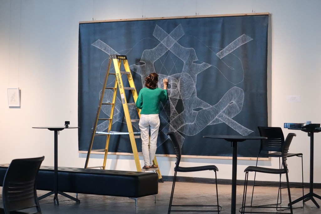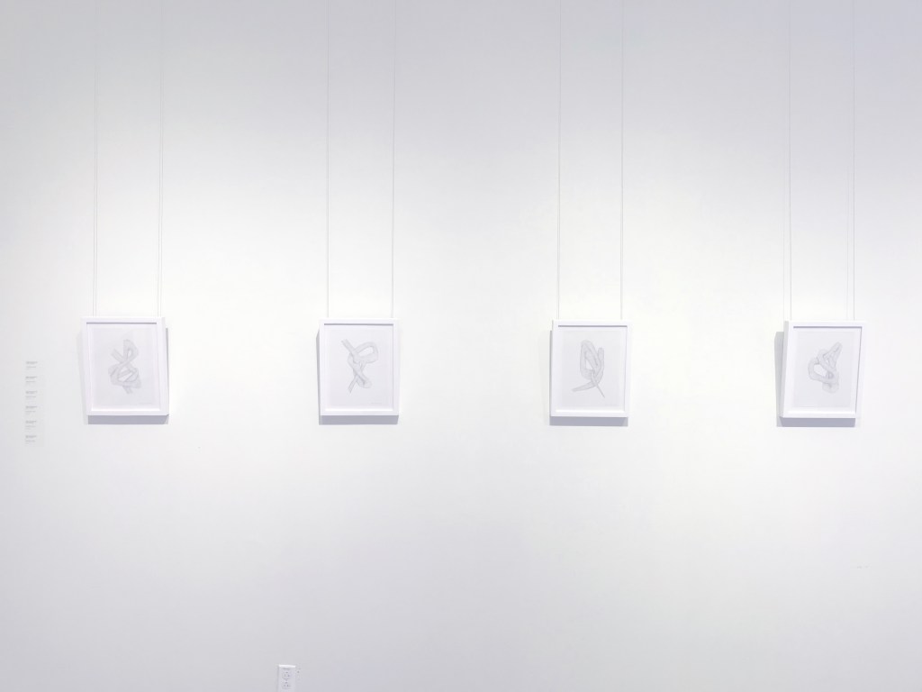 Pour cette exposition, de façon très spontanée et intuitive, l’artiste a bâti deux séries composant chacune un lexique graphique distinct. Métaphoriquement, elle nous propose, dans un premier temps, un jeu de lignes torsadées qui a mené à la composition de la murale centrale. Plongeant ensuite dans l’observation en direct des athlètes, les formes se sont rapprochées du vivant, du corps en soi.