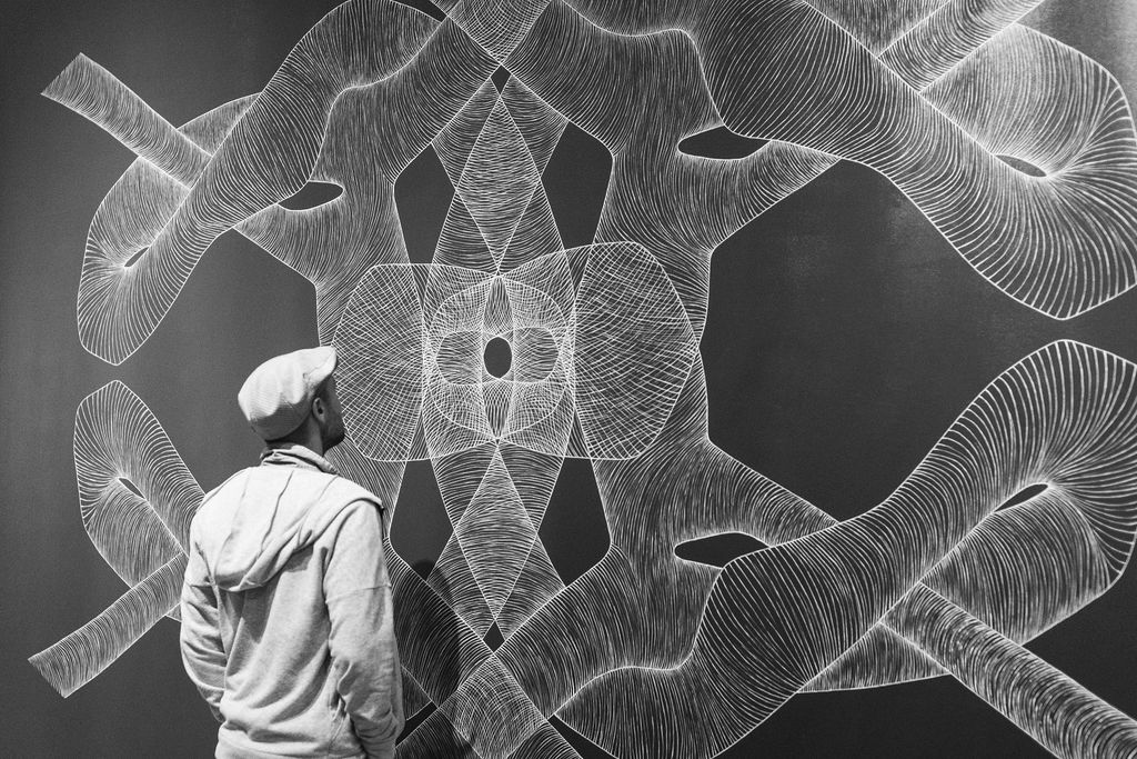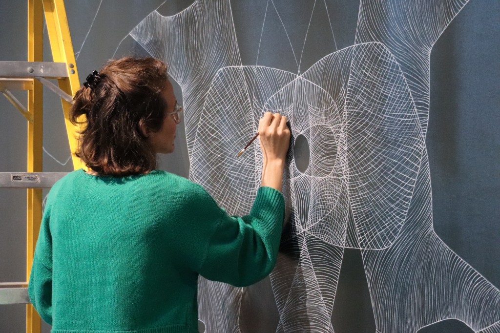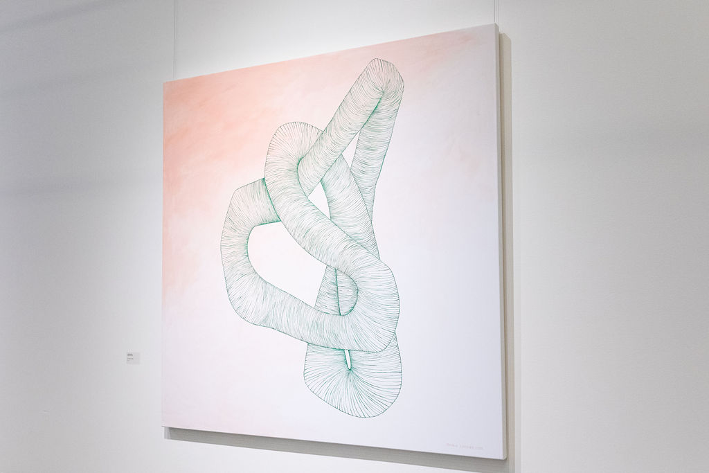 The Contorsions exhibition was conceived and produced as part of a three-month residency at La Tohu, in the summer of 2022. Following a first experience within the 7 Doigts de la main in February, Onira Lussier continues here her research around the circus arts. Coming herself from the world of the living arts, she builds, through drawing, organic forms whose technique is based on a great sensitivity to the body. Fascinated by the physical (or bodily) discipline in which circus athletes indulge, the artist sees a direct parallel with her very meticulous work of drawing. From repetition and mastery comes creation. In recent years, her approach has led her to approach the trace of the drawing in a sculptural way, forming, through the hatched line, matrices which can then be recovered for a future composition, using digital tools. For this exhibition, in a very spontaneous and intuitive way, the artist has built two series, each comprising a distinct graphic lexicon. Metaphorically, she initially offers us a play of twisted lines that led to the composition of the central mural. Then plunging into the live observation of the athletes, the shapes became closer to the living, to the body itself. The Contortion is declined here by an aesthetic of the twisted line, evoking the tools: the rope and the body.